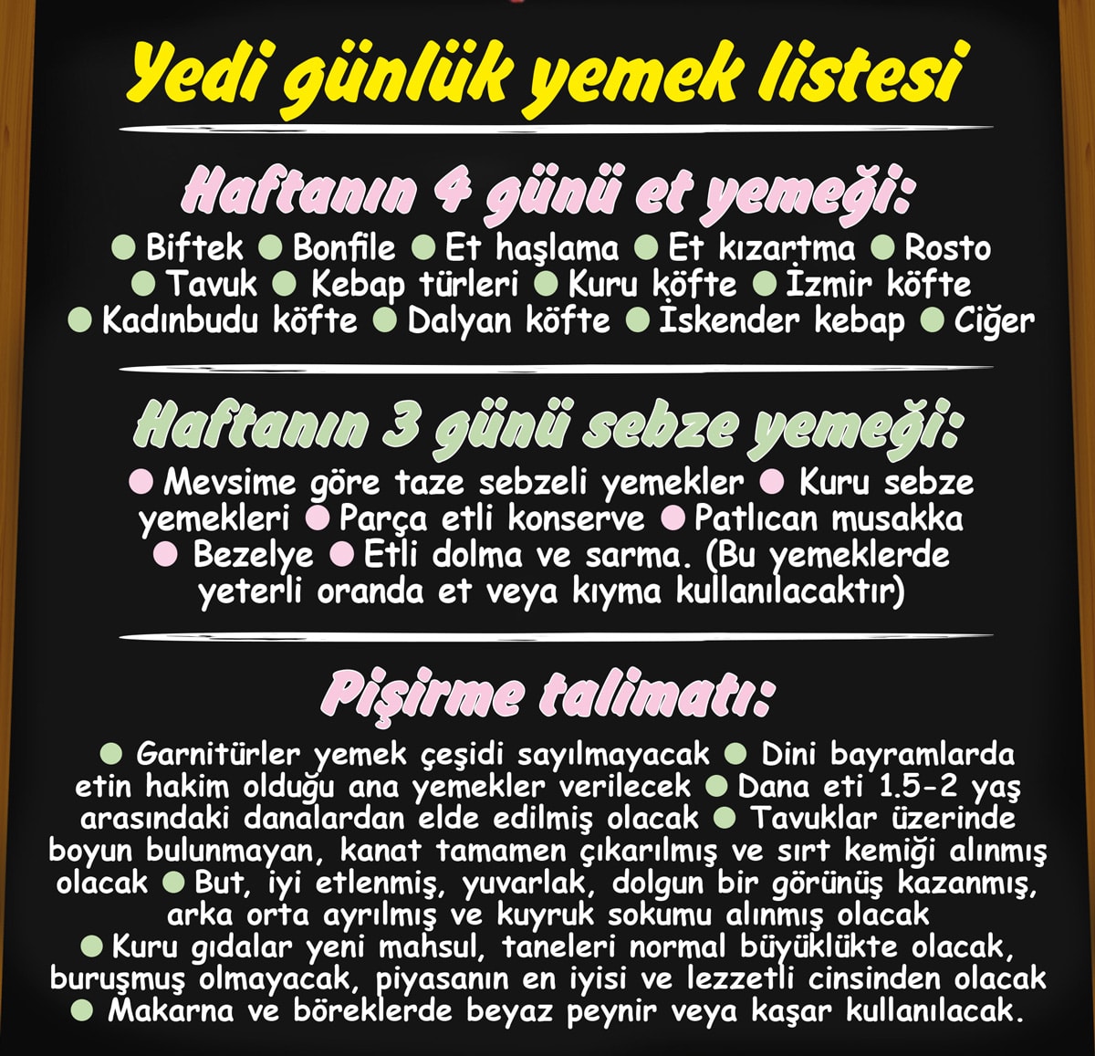 Haftanın üç gününde de mevsime göre taze sebzeler, kuru sebze yemekleri parça etli konserve ya da taze sebze yemekleri, bezelye, patlıcan musakka, etli dolma ve sarmalar vb. (bu yemeklerde de yeterli oranda et veya kıyma kullanılacaktır) verilecek. Garnitürler yemek çeşidi sayılmayacaktır. Kuru gıdalar, piyasanın en iyisi ve lezzetli cinsinden olacak. Makarna ve böreklerde beyaz peynir veya kaşar kullanılacak.”