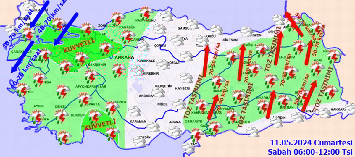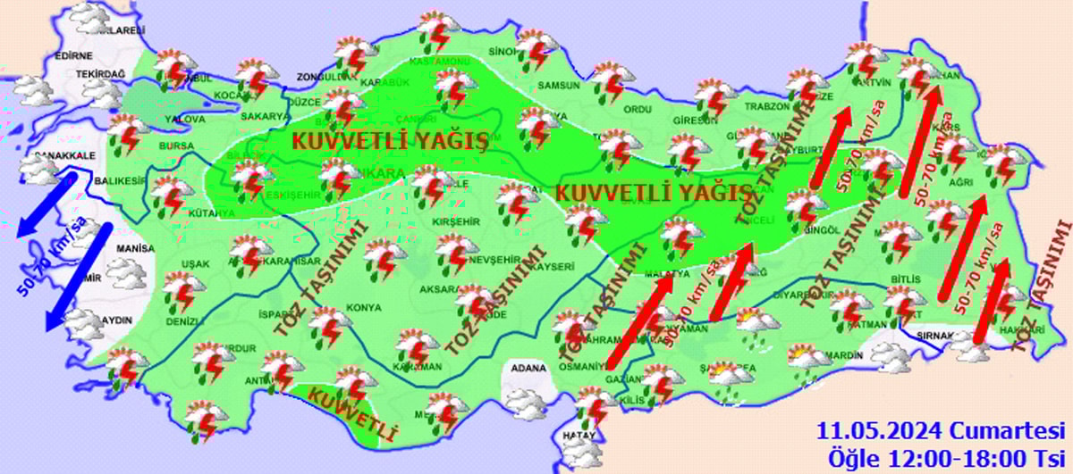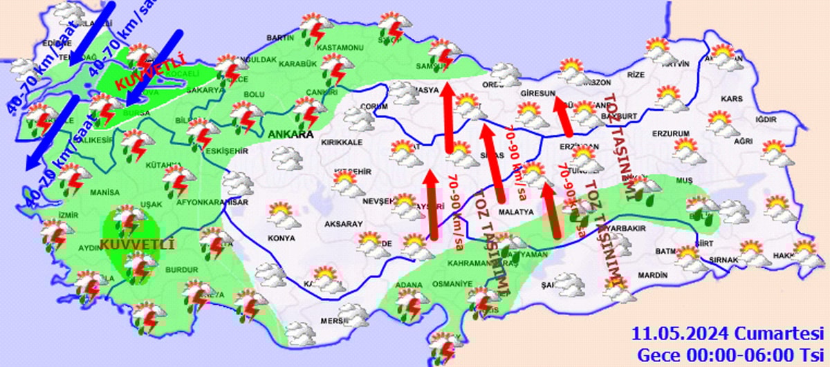 Meteoroloji Genel Müdürlüğü (MGM) tarafından yapılan son değerlendirmelere göre, ülke genelinin parçalı ve çok bulutlu, Şırnak dışında tüm yurdun aralıklı sağanak ve gök gürültülü sağanak yağışlı geçeceği tahmin ediliyor. Yağışların; Marmara’nın doğusu, İç Anadolu’nun kuzeyi, Batı ve Orta Karadeniz’in iç kesimleri, Doğu Anadolu’nun kuzeybatısı ile Aydın, Denizli, Manisa, Kütahya ve Antalya çevrelerinde yerel kuvvetli olması bekleniyor. Doğu kesimlerde toz taşınımı bekleniyor.
