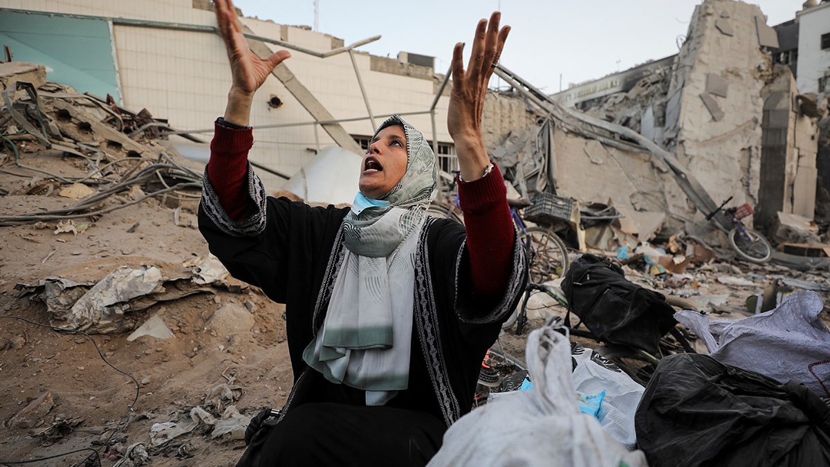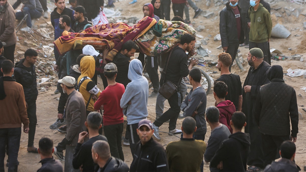 Şifa Hastanesinin güneybatı tarafında Filistinliler, bir taraftan Acur ve Habbuş ailelerinin evlerinin yıkıntıları altından ölülerin cesetlerini çıkarmaya çalışırken, diğer taraftan Ömer Muhtar Caddesi ve çevresindeki cansız bedenleri topluyorlar.
