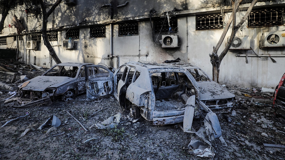 İsrail ordusunun, hastane ve çevresini yakıp yıkmasının ardından bölgeye nükleer bomba atılmış gibi büyük bir tahribat meydana geldi.